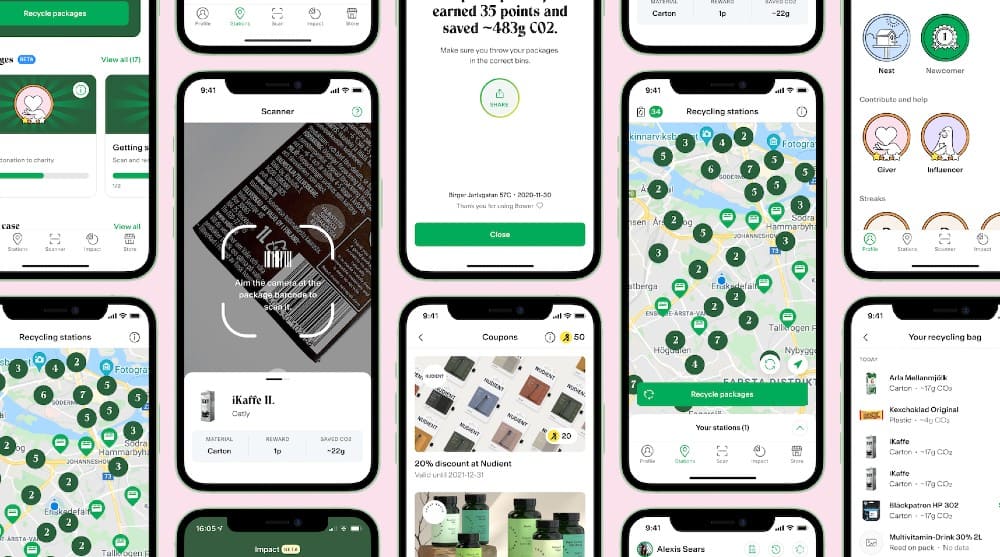 Hitta närmaste återvinningsstation i Bower-appen – eller registrera din egen! Du kan panta överallt där det är tillåtet att återvinna – det vill säga. även vid kvarterets eget miljörum, villans flerfackskärl eller, som i vissa kommuner, med dina egna optibags.